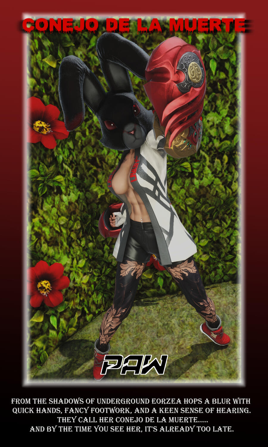 Ripped from the wilds outside the City of Gelmora by a pair of cultists 4 years ago the lone guardian and what she guarded was pulled from an alternate version of Eorza to this version and bound here. When she arrived it was in the middle of a wrestling show as not to let the crowd in on the fact her arrival was planed they had her wrestle with the person who was ment to have a promo that night. After several shows the season ended and with her condition getting worst she had to sit out of season 2 out of fear for her health. Now with it cleared up the mysterious guardian is back and not limited anymore like she was in the first season.