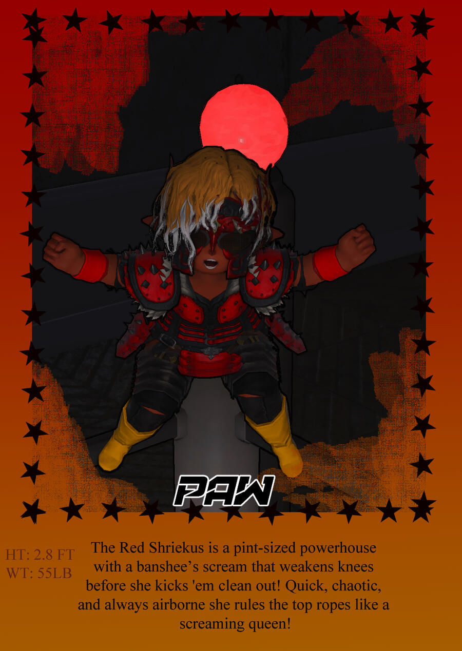 "Having emerged from the dragon's spine outside of Camp Dragonhead, a fighter with an inner fire burning hotter than the dragons breath.. the wiry firecracker, Ruby "Big Red" Bellacina, has come to the ring for one thing in mind.. the chance to compete in a competition of physical endurance and strength... P.A.W."